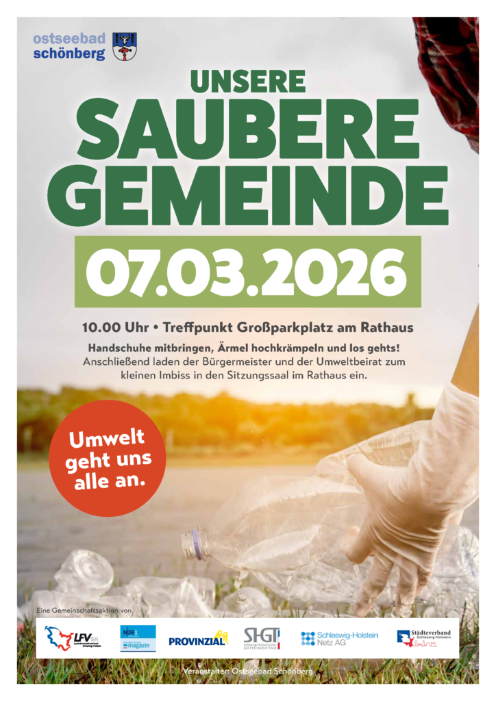 auch in diesem Jahr beteiligt sich unsere Gemeinde an der landesweiten Umweltaktion „Unser sauberes Schleswig-Holstein“. Der erste stellv. Bürgermeister Herr Peter Ehlers und die Vorsitzende des Umweltbeirats Frau Christel Simmich laden Sie herzlich ein, gemeinsam aktiv zu werden und Schönberg von achtlos weggeworfenem Müll zu befreien.
