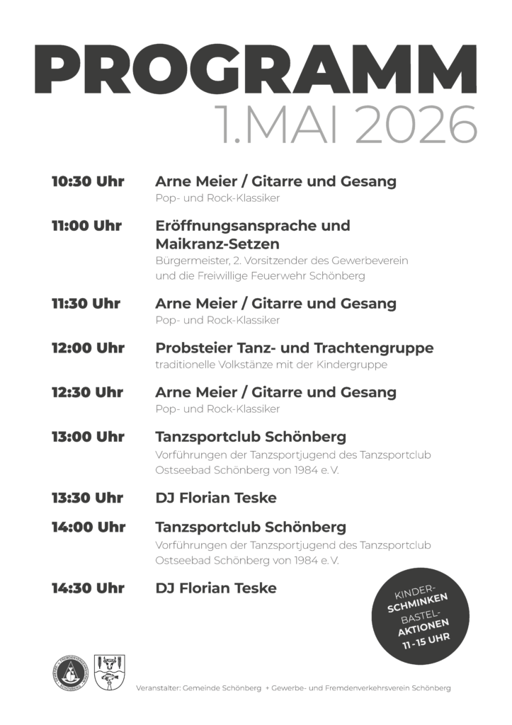 Am 1. Mai 2026 lädt die Gemeinde Schönberg gemeinsam mit dem Gewerbe- und Fremdenverkehrsverein herzlich zum traditionellen Maibaumfest in die Schönberger Fußgängerzone ein. Von 10:30 bis 15:00 Uhr erwartet Besucherinnen und Besucher ein abwechslungsreiches Programm für die ganze Familie.