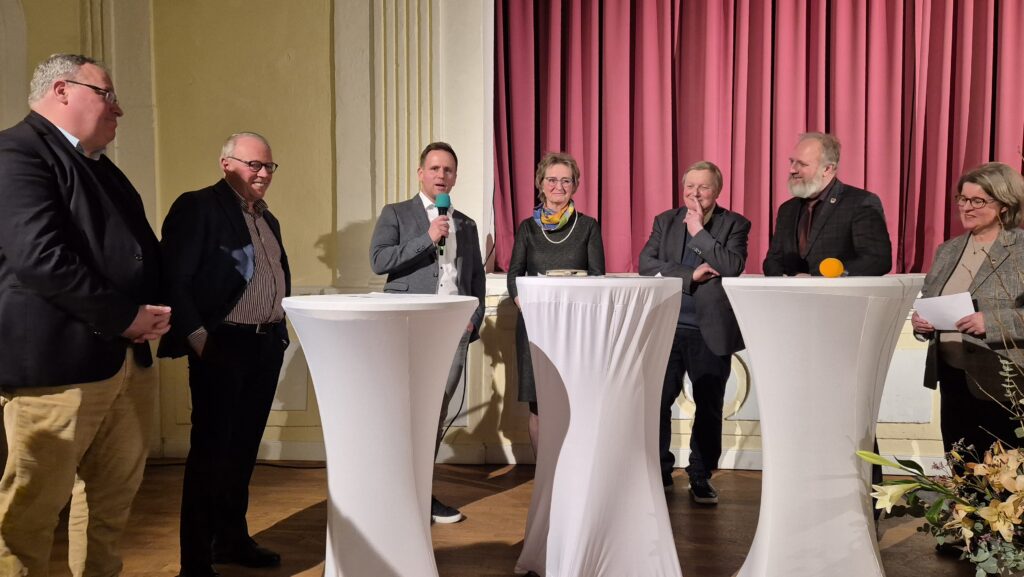 Zu Beginn des Abends erfolgte vorweg unter der Moderation der Bürgervorsteherin und des Bürgermeisters statt Grußworten eine Talkrunde mit Vertreterinnen und Vertretern aus Politik und Verwaltung. Darin kamen Kreispräsidentin Hildegard Mersmann, Landtagsabgeordneter Werner Kalinka, Amtsvorsteher Wolf Mönkemeier, Amtsdirektor Christian Hasler und Schulverbandsvorsteher Lutz Schlünsen zu Wort. Neben kommunalpolitischen Themen wurden in den Redebeiträgen auch die nationalen und globalen Herausforderungen angesprochen. Ein weiterer inhaltlicher Schwerpunkt lag auf den Themen Bildung und Sport. Vorgestellt wurden u.a. vom Schulverbandsvorsteher Schlünsen die Schulneubauten nach dem Brand des Schulgebäudes sowie die Fertigstellung des Neubaus der großen Sporthalle, die als moderne und dauerhaft nutzbare Einrichtungen beschrieben wurden. Im Zusammenhang mit dem Kunstrasenplatz lobte Kreispräsidentin Hilla Mersmann ausdrücklich die Entscheidung der Gemeinde für einen hochwertigen Nonfill-Belag ohne Mikroplastikgranulat. „Diese Lösung sei zwar kostenintensiver, biete jedoch einen geringeren Pflegeaufwand und eine deutlich bessere Umweltbilanz“, so die Kreispräsidentin.