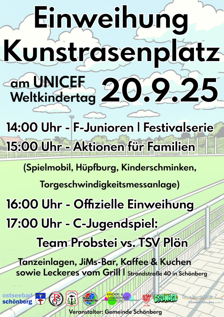 Nach der offiziellen Freigabe am 9. August 2025 lädt die Gemeinde Schönberg herzlich zur großen Einweihungsfeier des neuen Kunstrasenplatzes an der Strandstraße ein.